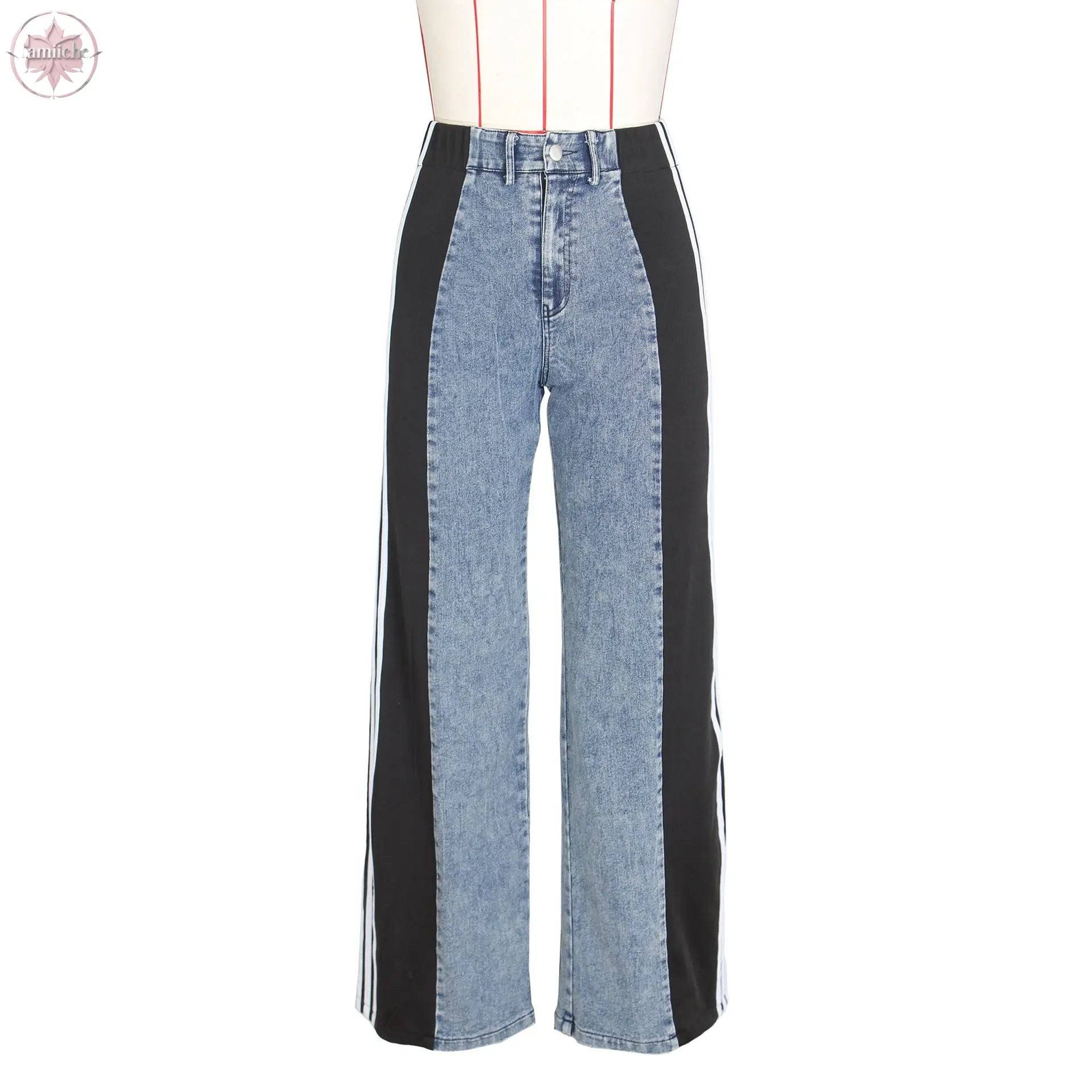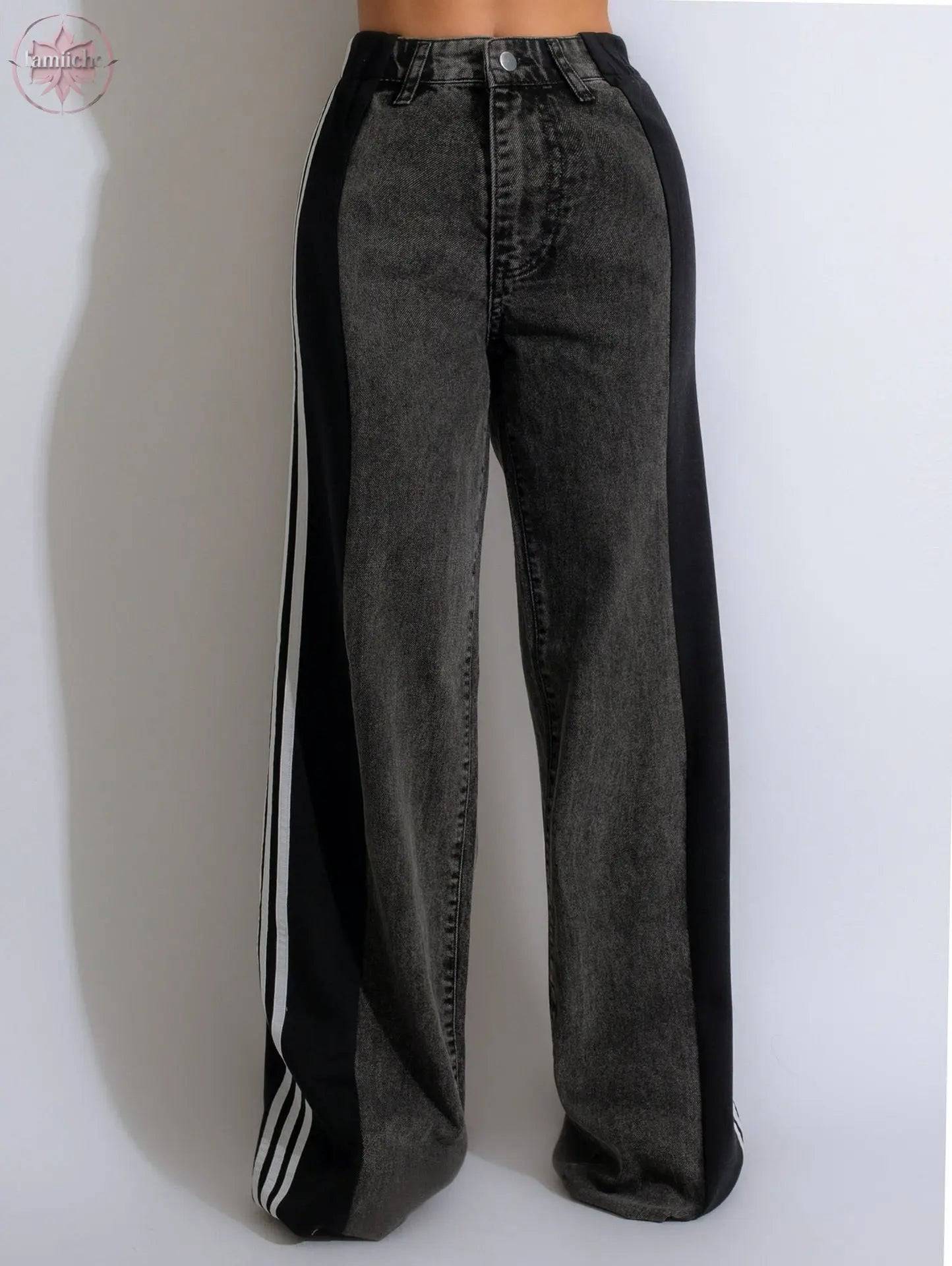 2024 Fashion Casual High Waist Elastic Straight Leg Trousers Three Stripe Patchwork Denim Wide Leg Pants Streetwear -