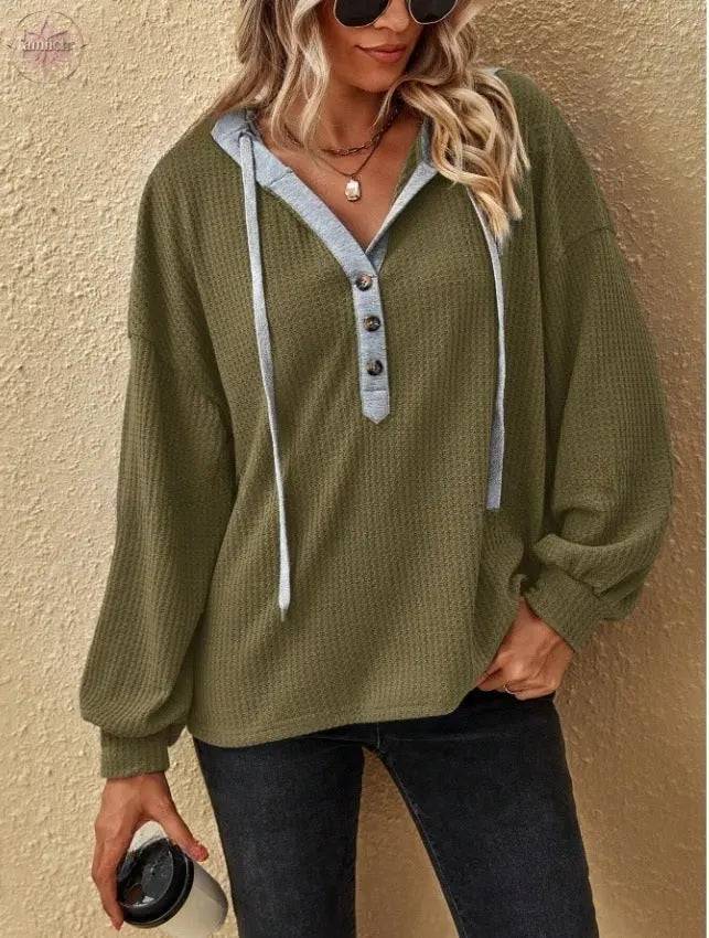 Casual Sports Button Hooded Sweatshirt Loose Long Sleeves Hoodies Fashion Solid Tops Womens Clothing