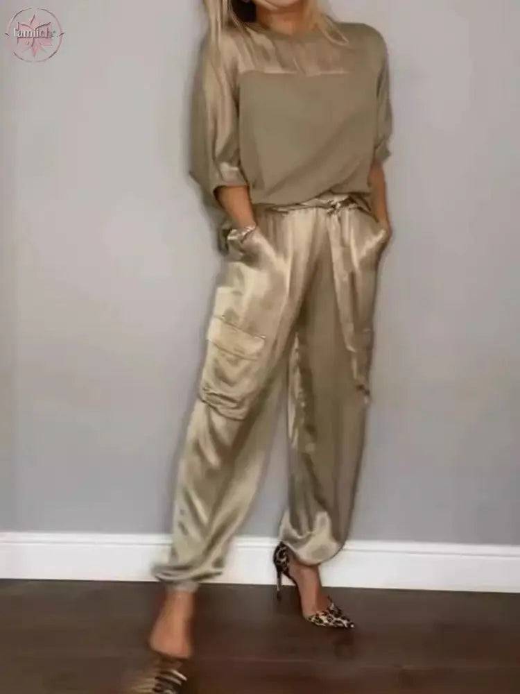 Fashionable women's solid color smooth satin five quarter sleeved top